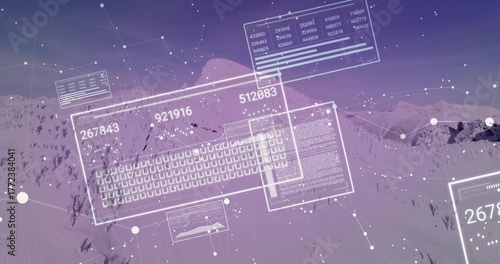 Fototapeta premium Projecting holographic interface showing keyboard, numeric panels, grid above snowy violet peaks