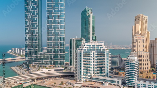 © HyperlapsePro, Fototapeta premium Promenade and canal seen from Dubai marina timelapse. Aerial view to JBR district and Bluewaters Island behind