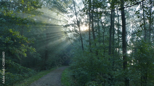 © Marian, Fototapeta premium Promień słońca o poranku. Jesienią i latem. Po mgielnym poranku. Las w Bytomiu. Polska