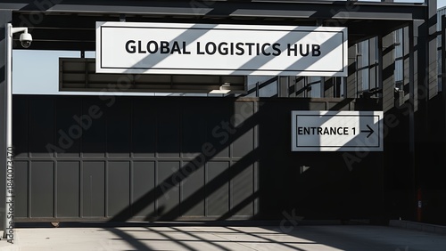 © A5, Obraz premium Prominent "GLOBAL LOGISTICS HUB" sign at the entrance gate of a large industrial facility, indicating a major distribution center.