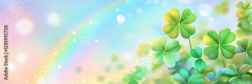 © Sunny, Fototapeta premium Prominent shamrocks are growing in a field with other shamrocks and a rainbow in the background