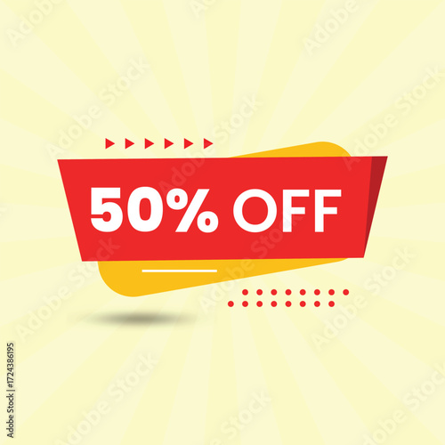 © graphicsobai, Fototapeta premium Promotional banner with 50 discount offer on yellow rays background for marketing campaign