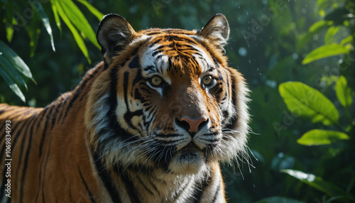 Fototapeta premium Prompt: A majestic tiger with piercing eyes, standing in a lush, green jungle. Raindrops glisten on its fur, adding to the atmosphere of the image.