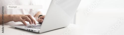 © comzeal, Fototapeta premium Prompt engineering skills concept. Businessman working on laptop with exploring artificial intelligence ai technology innovation and typing a prompt into search bar on keyboard computer