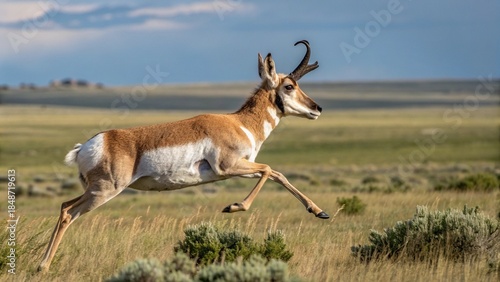 Obraz premium Pronghorn antelope running freely in open grassland landscape