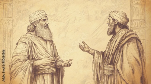 Fototapeta premium Prophet Rebukes Amaziah in the Palace in 2 Chronicles, Confronting Him for Turning to the Idols of Edom, Biblical Illustration for Faith-Based Reflection, Beige Background