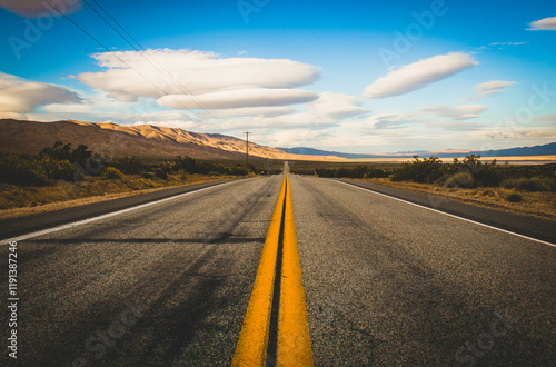 © mirame111, Naklejka premium Prosta droga przez pustynny krajobraz pod błękitnym niebem