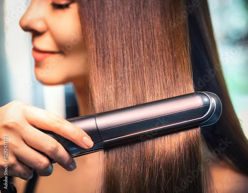 © Monika Janiak-Klicha, Fototapeta premium Prostowanie włosów prostownicą