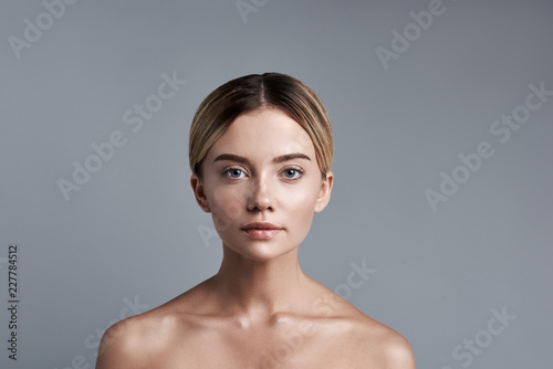 © Yakobchuk Olena, Fototapeta premium Prosty portret. Spokojna śliczna jasnowłosa dama siedząca na szarym tle z nagimi ramionami i lekko uśmiechnięta, patrząc na ciebie
