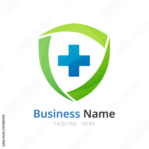 © Shinonome Studio, Obraz premium Protect Health Logo, modern logo design incorporating a stylized shield with a blue plus symbol inside.