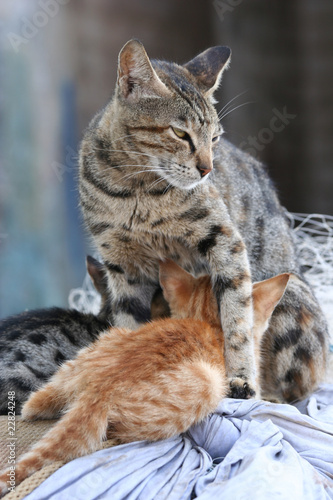 Naklejka premium Protective cat guarding while kittens eating