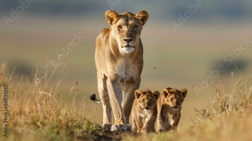 © ColdFire, Fototapeta premium Protective lioness leading cubs through golden grassland at sunrise