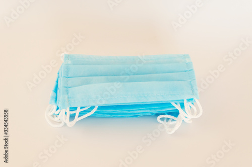 Fototapeta premium Protective medical masks are stacked on the table. Preparation for the...