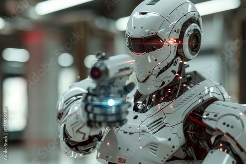 Fototapeta premium Protective virtual codes weave a digital armor around an AI robot, An AI robot defending against cyber attacks, An AI robot is standing in a server room