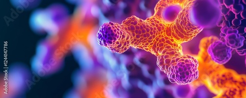 Fototapeta premium Protein folding glowing in orange and purple, abstract fluorescence microscopy art