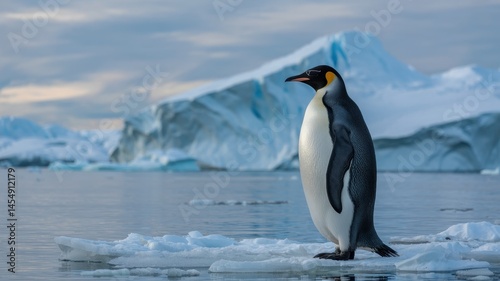 © Nemanja, Obraz premium Proud Emperor penguin on ice floe with colossal blue iceberg behind