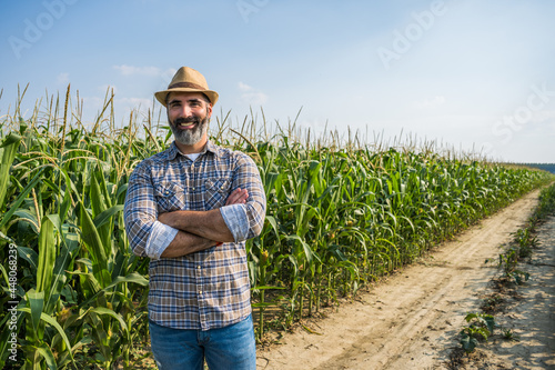 Fototapeta premium Proud farmer is standing in his growing corn field. He is satisfied because of successful season.