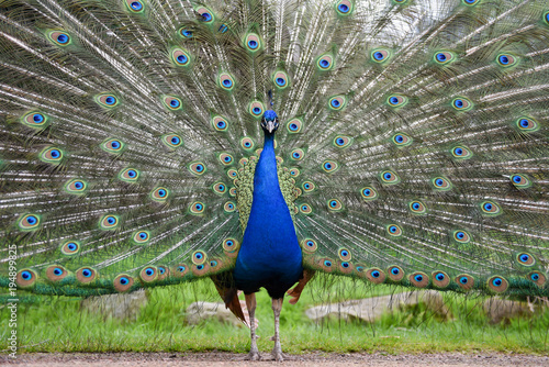 Obraz premium Proud male peacock, peafowl displaying extensive plumage, shimmering tail