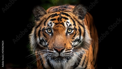 © netsay, Naklejka premium Proud Sumatran Tiger Stalking Towards Camera Majestic Big Cat in Vibrant Jungle Scene at Twilight, Displaying Dignity and Power