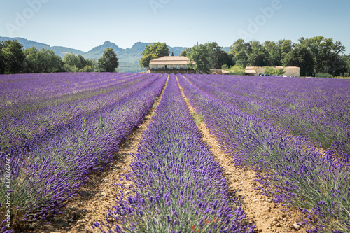 Naklejka premium Provence Drome lavender rows and house with mountain horizontal