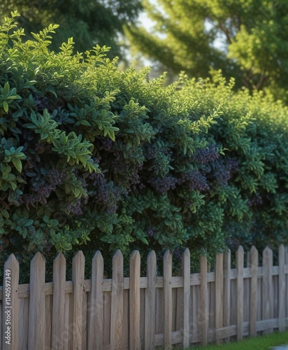 © สิริวุฒิ นาคโคตร, Fototapeta premium Pruned black frosty privet Ligustrum vulgare shrub on a garden fence, foliage, garden fence, leafy branches