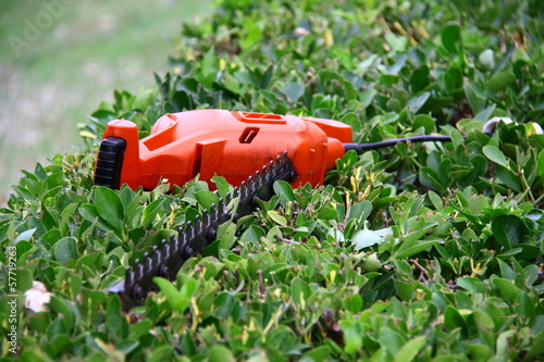Naklejka premium pruning tool on green shrub