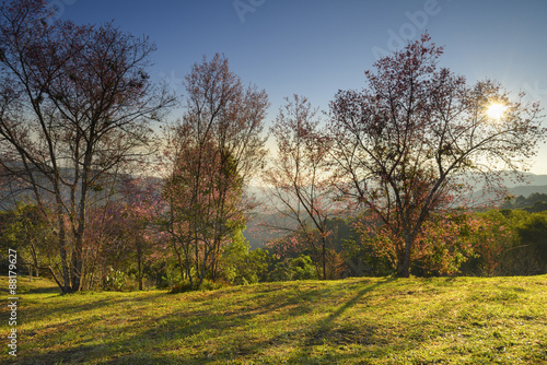 © pornsakamp, Naklejka premium Prunus cerasoides and Sunrise