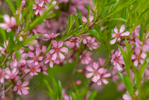 © Arina B, Obraz premium Prunus tenella blooms with pink flowers, bush in spring