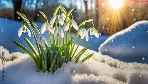 Fototapeta premium Przebiśniegi rosnące w ogrodzie w promieniach słońca. W tle wczesnowiosenny ogród z topniejącym śniegiem. Symbol wczesnej wiosny