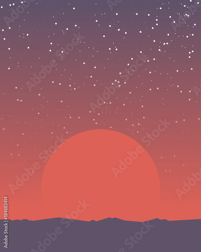 Fototapeta premium Przestrzeń retro tło. Powierzchnia planety przypomina Marsa i ogromne czerwone olbrzymie słońce wschodzące nad horyzontem. Gradientowe niebo planety. Góry i skały na horyzoncie planety. Wiele jasnych gwiazd na niebie.