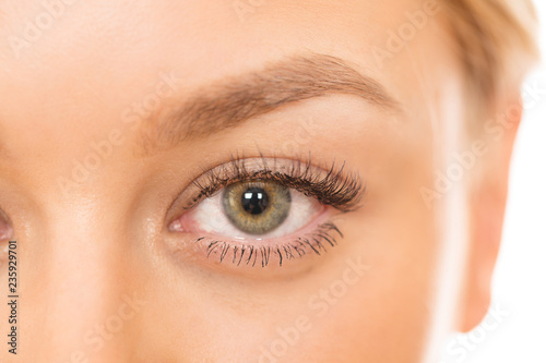 © mad_production, Fototapeta premium Przycięte zbliżenie oka przepięknej naturalnie pięknej kobiety odizolowanej na biało piękno kosmetologia pielęgnacja skóry kobiecość pewność oczy twarz zdrowa skóra nieskazitelna gładka miękka świeża czysta