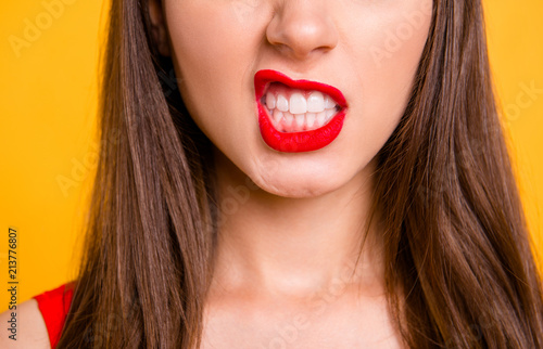 © deagreez, Fototapeta premium Przycięte zbliżenie widok pół twarzy widok zdjęcie portret seksualnej uwodzicielskiej kuszącej suki fajnej hipster pani pokazująca zęby mówiące nieprzyjemne słowa na błyszczącym jasnym, żywym tle