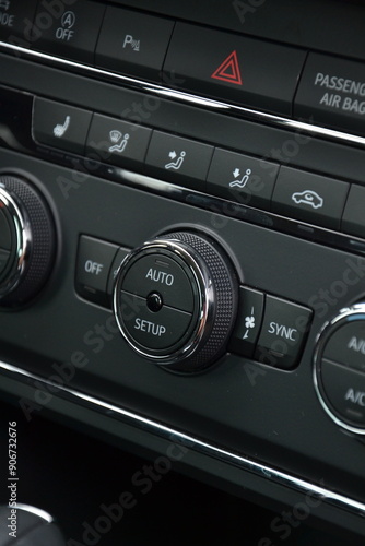 © VILKTERIO, Fototapeta premium Przycisk pokrętło regulacji temperatury w aucie samochodzie w czystym wnętrzu auta