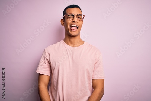 © Krakenimages.com, Obraz premium Przystojny Afroamerykanin ubrany na co dzień t-shirt i okulary na różowym tle mrugając patrząc w kamerę z seksowną ekspresją, wesołą i szczęśliwą twarzą.