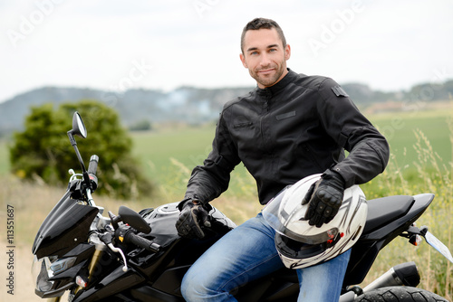Obraz premium przystojny młody mężczyzna rowerzysta z białym kasku na czarnym motocyklu