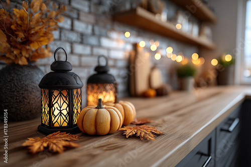 Obraz premium Przytulny, jesienny wystrój kuchennego blatu: dynie, lampiony ze świecami,...