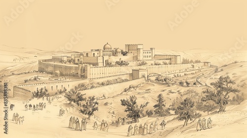 Fototapeta premium Psalms 122 Biblical Illustration: Joy at going to Lord's house, praying for...