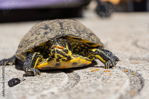 © Santiago, Obraz premium Pseudemys eating on a white tile floor