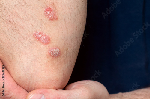 Fototapeta premium Psoriasis on the elbow. A man shows a focus of psoriasis on his body