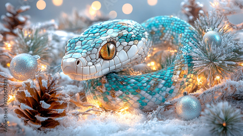 Fototapeta premium Psychedelic glittering snake in Christmas surroundings