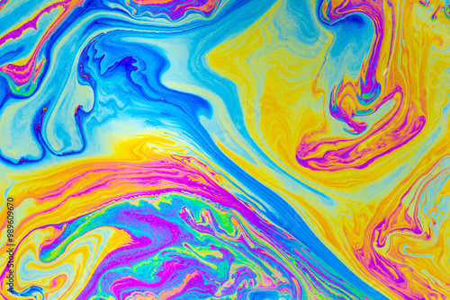 © Achira22, Naklejka premium Psychedelic multicolored background abstract. Rainbow colors. patterns background. Photo macro shot of soap bubbles