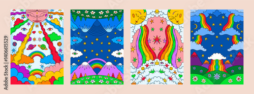 Obraz premium Psychedelic rainbows. Retro art poster. Vintage sixties landscape or 1970s mosaic forest. Sun and sky clouds. Crazy eyes.1960s nature. Hippie hallucinogen. Vector surreal banners set