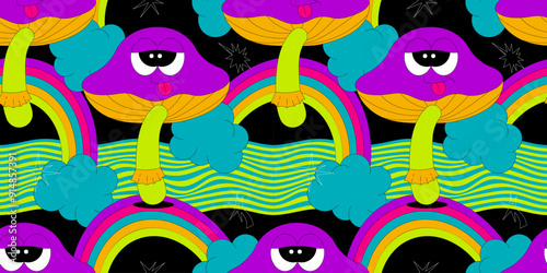 © Dukhanina Ekaterina, Naklejka premium Psychedelic seamless pattern with characters in groovy style. The mushroom, rainbow, clouds and other elements. Retro vector background in acid colors on black