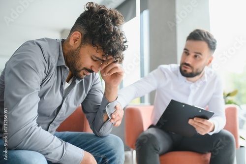 © Serhii, Obraz premium Psychologist comforting upset arab man during therapy session