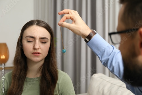 Fototapeta premium Psychologist using pendulum while working with patient during hypnosis session indoors, closeup