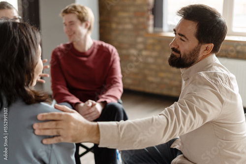 Obraz premium Psychotherapist comforting patient during group therapy session