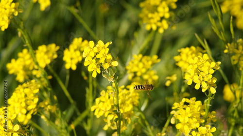 © Olga, Fototapeta premium pszczoła leci wśród żółtych kwiatów na łące