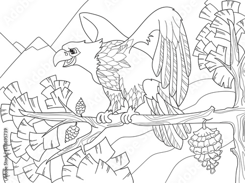 © toricheks, Obraz premium Ptakiem drapieżnym jest orzeł na gałęzi drzewa. Sokół na choince. Kolorowanki dla dzieci