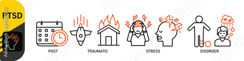 © tru3_Art, Obraz premium PTSD banner web icon set vector illustration concept of post, traumatic, stress and disorder with icon of calendar, time, rocket attack, war, house on flame, headache and disability