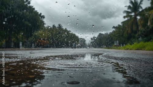 Obraz premium Public park during heavy rain with water spray and ripples in puddles, highlighting climate impact, Earth Day